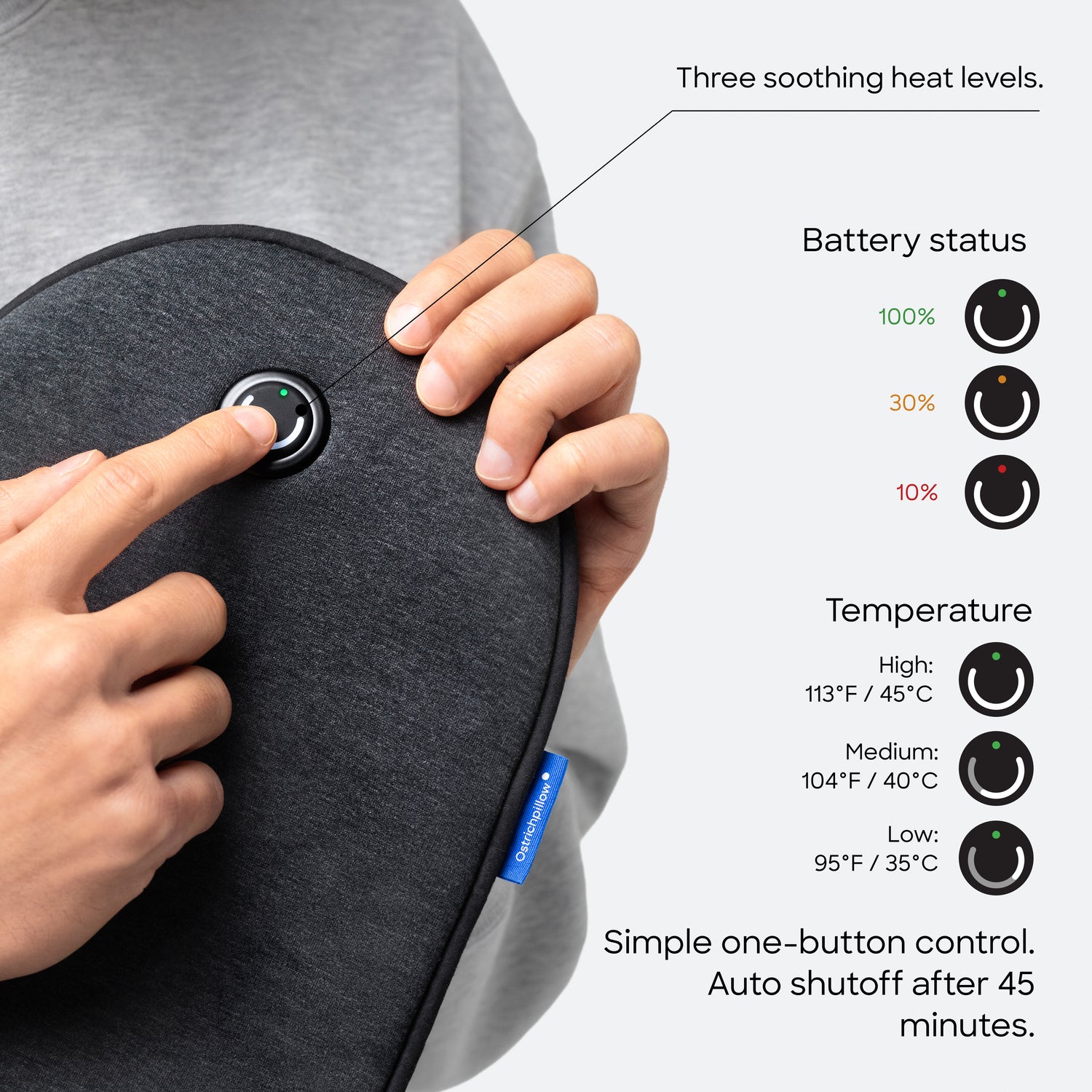 On the highest setting, it reaches a maximum temperature of 45°C (113°F) — the standard recommended level of heat that safely provides effective relief. However, personal preferences and sensitivity to warmth may vary, so we suggest starting on a lower setting and adjusting gradually until you find the level that feels best for you.