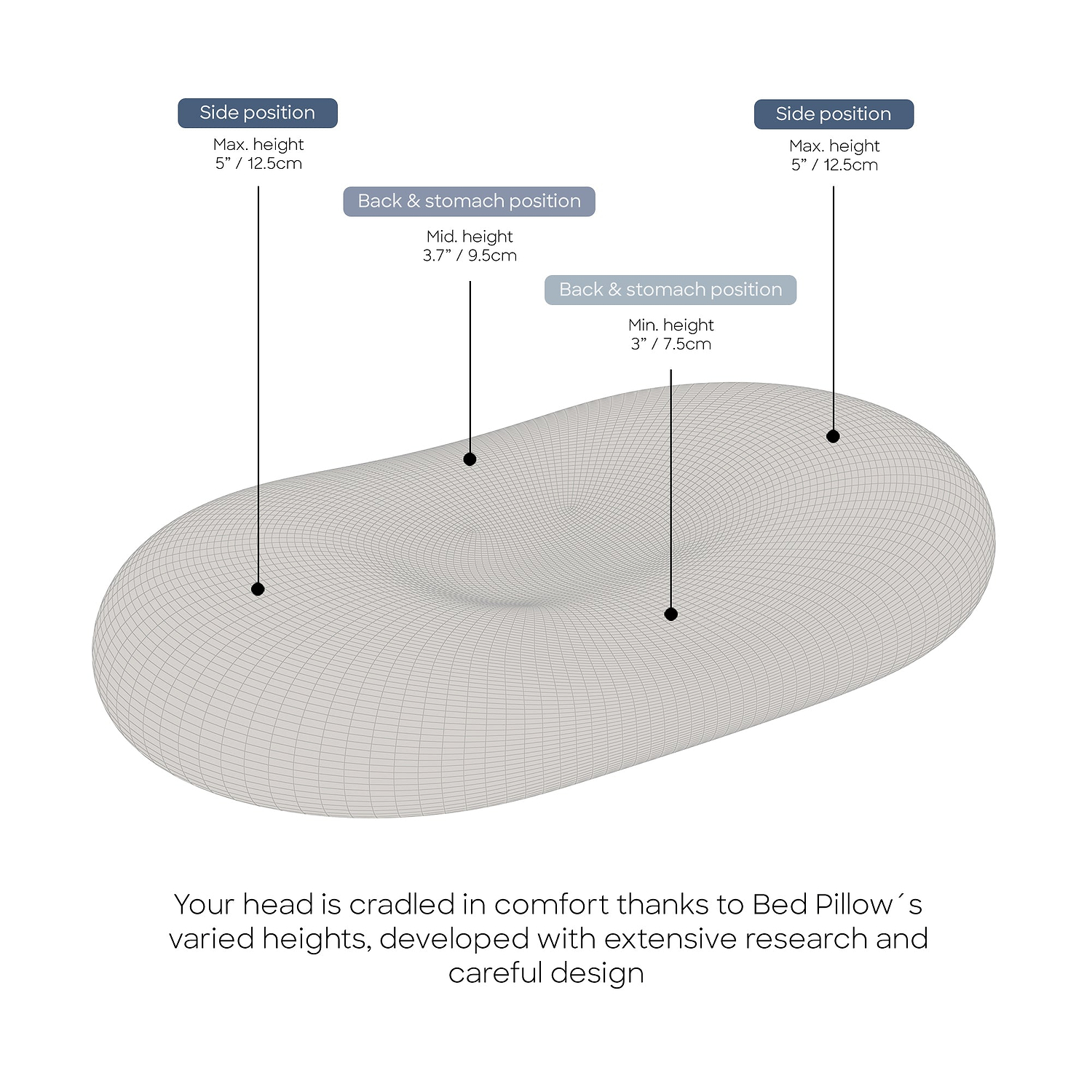 Bed Pillow's three-dimensional design, with different heights, fits the natural curvature of your neck. It can be used on both sides, so that the Bed Pillow adapts to you and not the other way around.